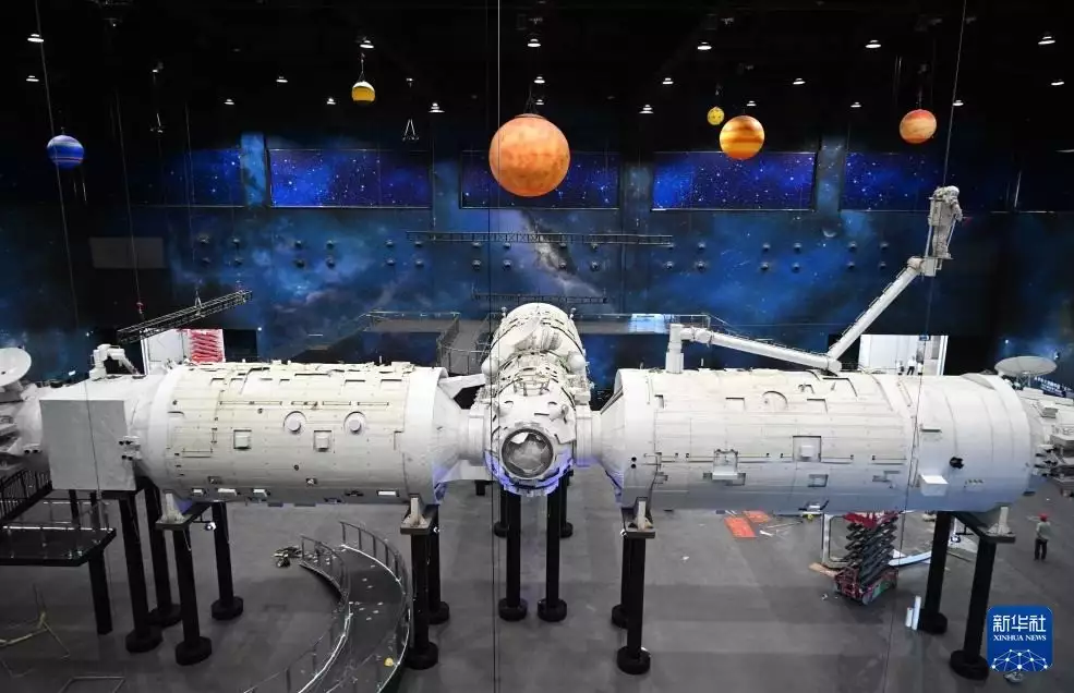 这是9月25日拍摄的珠海太空中心新馆的中国空间站组合体模型。