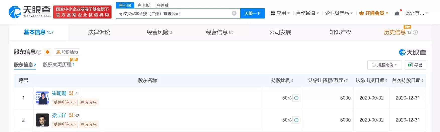 天眼查App显示,阿波罗智车科技(广州)有限公司发生了工商变更,法定代表人及执行董事聂育仁已卸任,接任者为何人石清华,他现已担任公司的法定代表人和董事,公司的主要人员也发生了一系列变更。